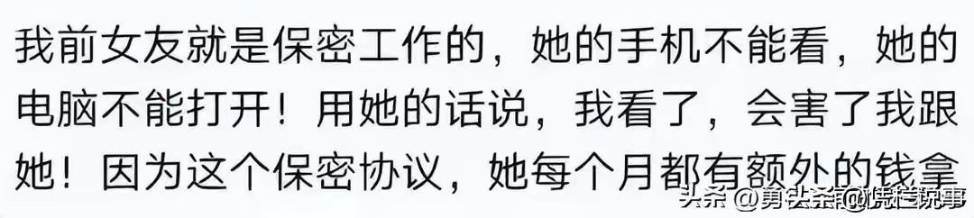 “有个拐弯几处的远亲,考上了警校,上大二的时候,家里来了几个平头黑衣人,无论父母怎样询问,对警校生情况一字不提,只是建议这个亲戚生二胎。”,一位网友评论道。原来有这么多工作需要保密!网友:牺牲12年的爸爸竟然回来了!在这种企业工作,手机肯定不能带进去有没有可能他爸妈是知道的,只是你不知道而已有些东西确实不能乱查手机的所以说那些喝醉乱说话的人最好不要乱喝酒你看...